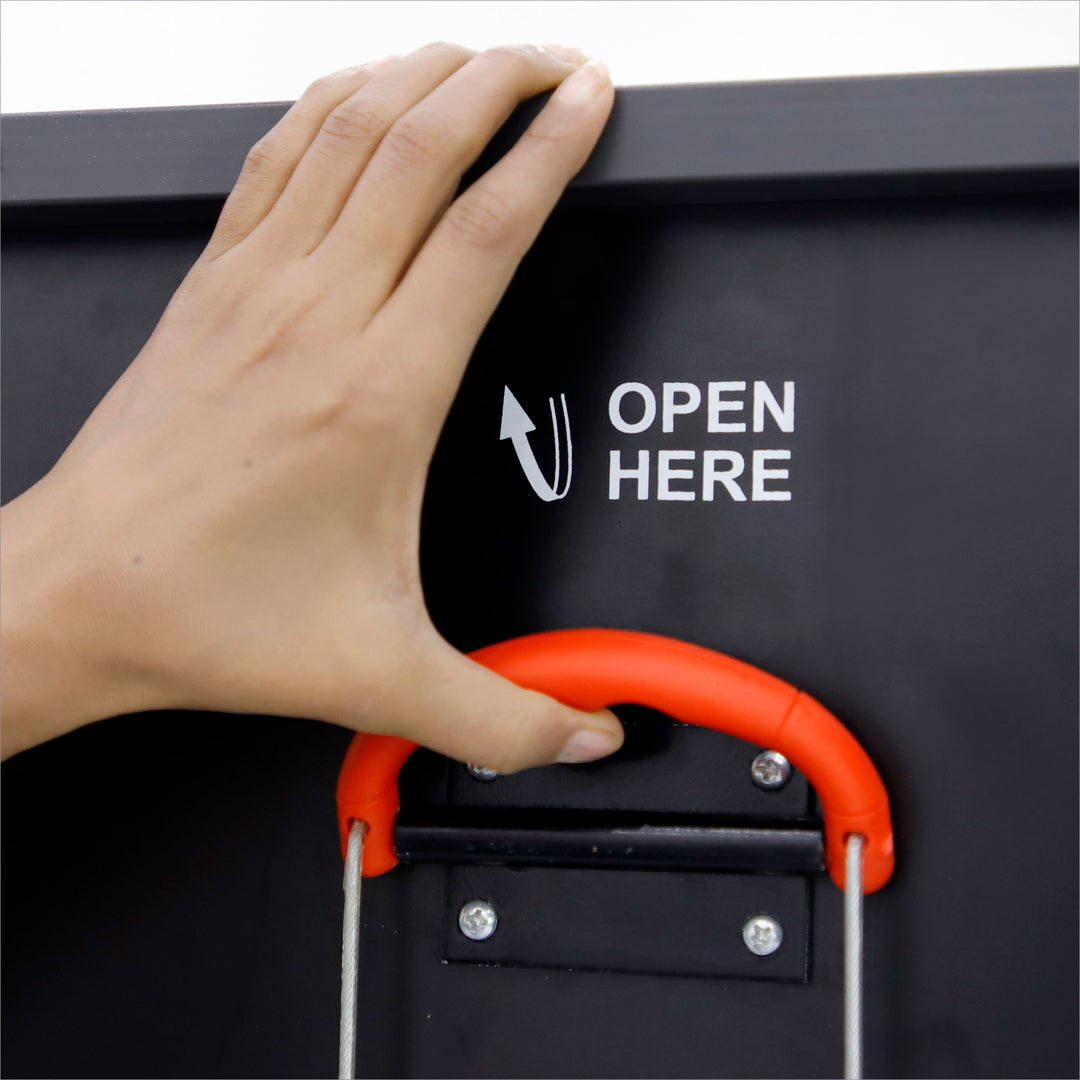 The single hand safety locking device on the underside of the table securely locks in all positions. With the ease of one hand the simple spring-loaded cable design keeps the table secure and family members safe from unfolding unexpectedly.