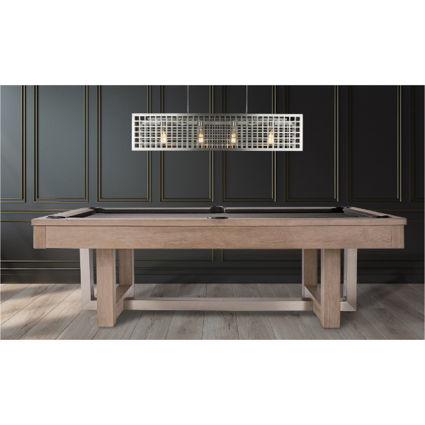 The Abbey pool table will elevate your game room to the next level. This contemporary design combines hybrid materials for an elegant, transitional look. This pool table features chrome hammered diamond rail sights, brushed stainless steel elements, and internal drop pockets.
