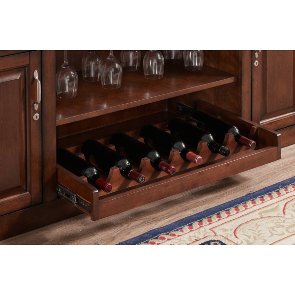 This 88” Bar is finished in Navajo with Brushed Steel accent hardware. It includes a foot pole, ice bucket, glass stemware holders, dual pullout wine bottle storage racks, plenty of storage shelving, locking cabinets and easy-glide storage drawers.
