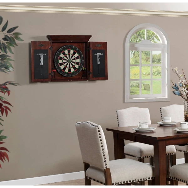 The Athos Dartboard features a solid pine and select veneers and is finished in a rich Sierra stain, this cabinet boasts a beautifully refined crown molding that’ll catch everyone’s eye. Inside the cabinet is a Tournament-quality bristle board, 2 scoring chalkboards, and two sets of 3 weighted steel-tipped darts. The dart board comes pre-attached to the cabinet for easy installation.