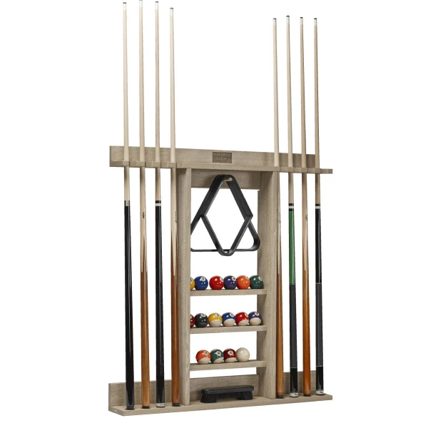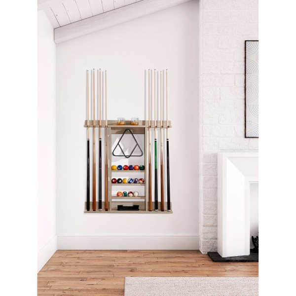 The Bluegrass Wall Rack is the perfect game room companion for organizing all your pool table accessories and provides a great place to share a drink with a friend. This cue rack holds 8 one-piece cues, a full set of billiard balls, triangle and nine ball racks, brushes, additional accessory storage and integrated cup holders with coasters for seamless home entertainment. Available in Charcoal, Natural Ash, and Black Ash finish options. Cheers!