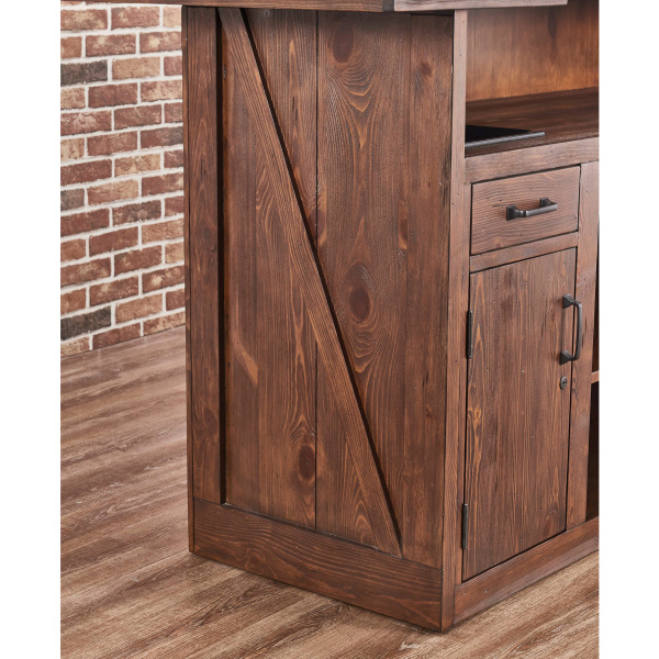 The barn side styled Bristol Bar comes complete with a built-in stone cutting surface, stemware holders and a removable ice bucket. This bar is also equipped with an Easy-Glide storage drawer, locking cabinet doors and storage shelving to serve all your entertaining needs. Classic knotty pine is finished in Rustic Brown for an inviting and homey finish. Charcoal finished bronze hardware accents complete the look.