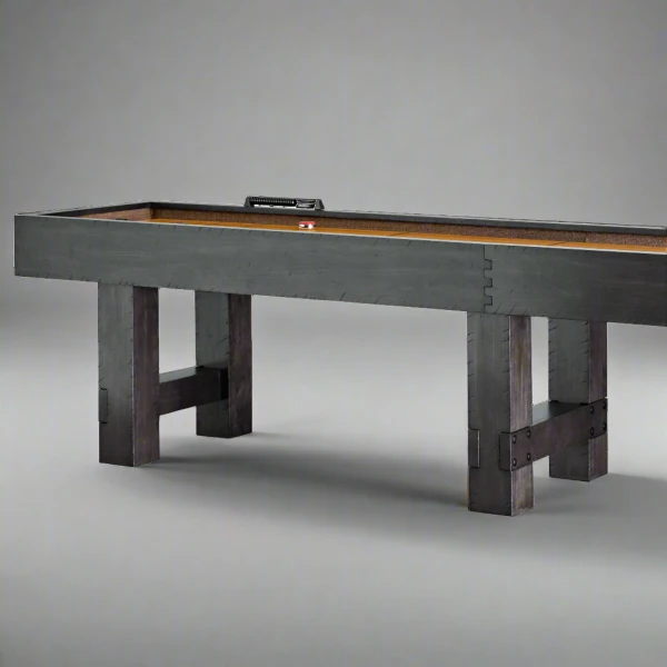 The Bristol shuffleboard is a refined rustic design that naturally compliments home décor with its unique charm. This shuffleboard features a popular playfield with climatic adjusters, solid style with rich Charcoal finish, and an abacus scoring system. Available in Charcoal and Harvest finish options.