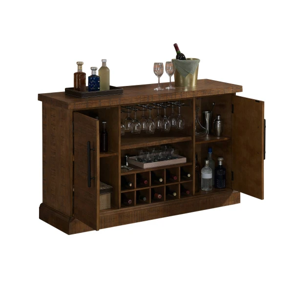 The Gateway Wine Cabinet is a great accent piece to any home. Its reclaimed industrial style provides excellent functionality and plenty of storage space. Glass stemware holders line the middle section of this cabinet while it also includes storage capacity for 10 bottles of wine.