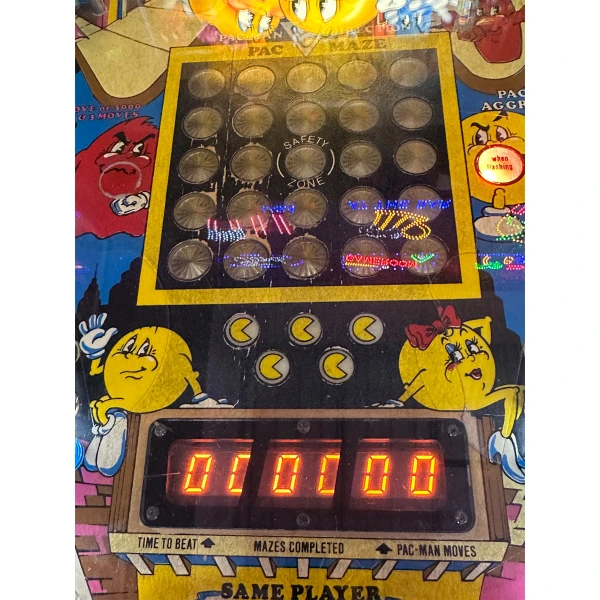 The 6-digit display in the playfield keeps track of your Pac-Maze progress. The right-most two digits let you know how many moves you have been awarded. The middle two digits keeps track of the number of Pac-Mazes completed. The left-most displays tracks the number of seconds you have left to complete the current maze. The five pacman lights below the 6-digit display indicate the number of ‘lives’ left for which the ghost (red light) in the maze can hit you when not in Aggressive mode.