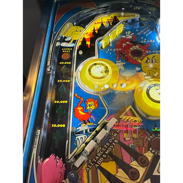 This pinball has 3 flippers, 11 drop targets, 6 standup targets, 2 pop bumpers, 2 sling shots, 2 saucers, and a 5×5 matrix of lights in the playfield called the Pac-Maze (Pac-Lite or Vid-Grid). It has a voice synthesizer with a rather large vocabulary for its time. Mr. & Mrs. Pac-Man has a diverse sound package which integrates many of the arcade Pac-Man sounds.