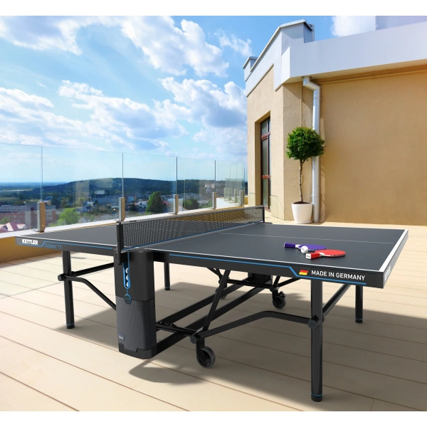 The KETTLER® OUTDOOR 15 is the new standard for a heavy-duty outdoor model that folds and rolls away. From the thickest gauge steel used in the industry to a very heavy table top, this model is fully built to last. The proprietary and weatherproof KETT-TEC10 composite top provides durability for outdoor use, and offers high performance playing characteristics including true ball bounce. The centerfold design has built-in patented features including SMOOTH TRAX and provides the ultimate in safety, transport and stability.