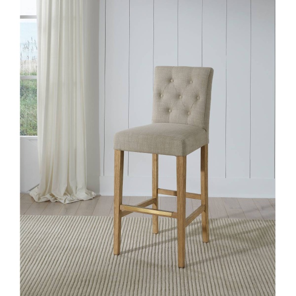 Finished in White Oak with Sahara Sand linen upholstery, the Bar Height Port Royal Backless Stool features, satin brass metal footplate, webbed seating for improved comfort and a 3″ linen cushion.