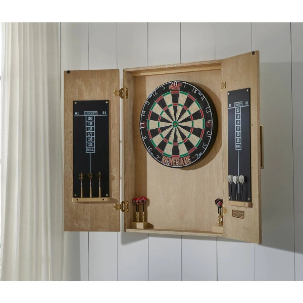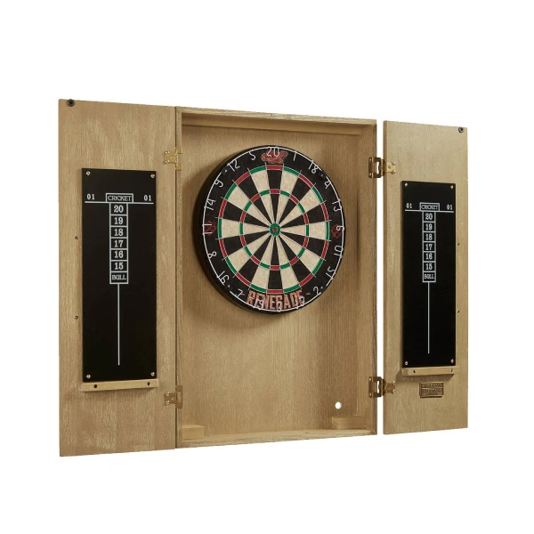 The Port Royal Dartboard includes a handcrafted cabinet with a white washed White Oak finish and rectangular satin brass hardware. The cabinet is designed to fit two extra sets of darts and large enough to suit both bristle and electronic dartboards depending on your choice, purchase separately. Inside the cabinet are two scoring chalkboards and a bronze American Heritage Billiards nameplate.