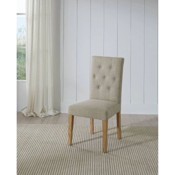 Finished in White Oak with Sahara Sand linen upholstery, the Dining Height Port Royal Backless Stool features, satin brass metal footplate, webbed seating for improved comfort and a 3″ linen cushion.