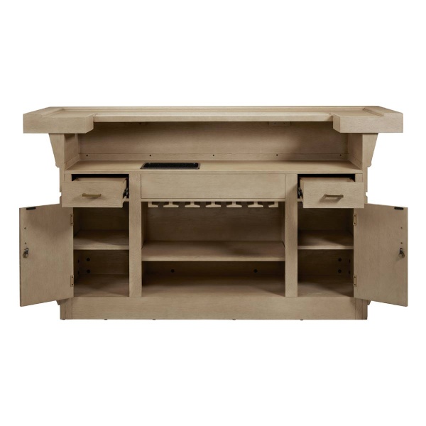 The Port Royal is designed to give you those beach house vacation vibes every time you enter your game room. With fresh clean lines, and simple forms; the white wash oak wood grain finish provides a contemporary design that can be relaxing and casual or staged as a formal, versatile piece in your home. This modern multi-functional piece features a removable ice bucket, glass stemware holders, a decorative footrest and plenty of storage shelving. This home bar also features locking cabinets for added safety, and convenient easy-glide storage drawers.
