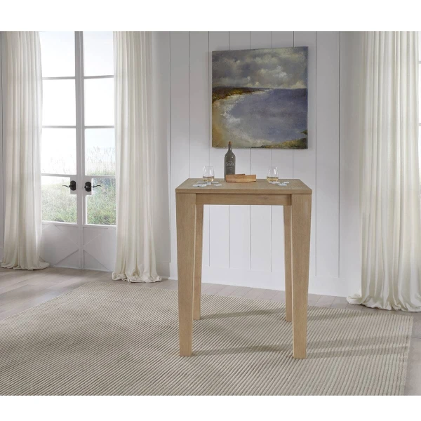 The elegant Port Royal pub table has a 34” square top and stands 42.5″ tall. It has a contemporary square top and sits on top of a tapered base, creating an intimate space for enjoying time with family and friends